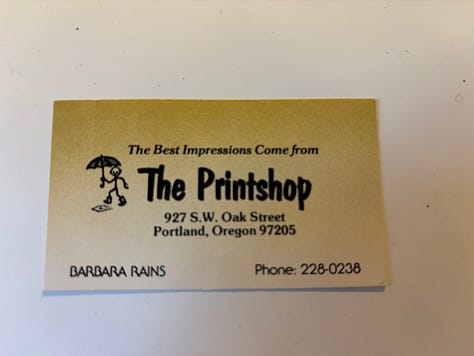 —My father ran a printshop in downtown Portland from the time I was a kid to when I was a young adult. I worked there off and on through all those years, too. Note the classic logo. This card has my Mom’s name on it.